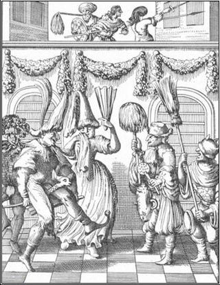 GRABADO DE JOHANN LEUSDEN (1624-1699). DISFRACES Y BUFONERÍAS EN PURÍN. UTRECH, PAÍSES BAJOS. 1657.