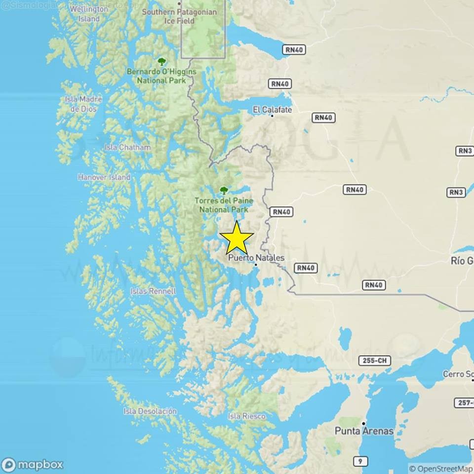 Los primeros datos registrados por sismógrafos chilenos indican que el epicentro fue a unos 35 kilómetros de la ciudad vecina de Puerto Natales con profundidad de 20 kilómetros.