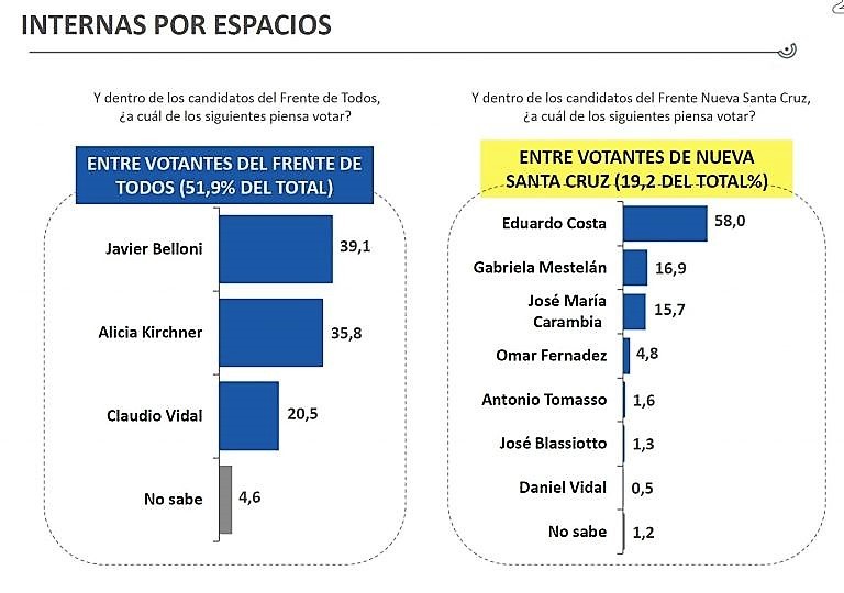 La consultora da por ganador al Frente de Todos que tiene a Alicia Kirchner, Javier Belloni y Claudio Vidal. Entre todos sumarían el 51,8% de los votos, ganando la gobernación frente al sector Nueva Santa Cruz al que pertenecen Eduardo Costa, Gabriela Mestelán y José María Carambia, frente al que la encuesta da un total de casi un 20 %.