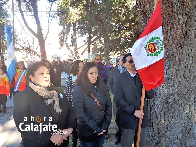 Una bandera de ceremonia peruana, portada por vecinos residentes en nuestra ciudad, se hizo presente en la ceremonia ocurrida en la plazoleta que se ubica en el centro de El Calafate, y que lleva el nombre del prócer argentino.