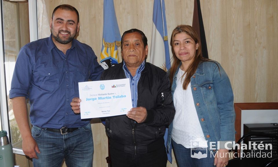 El secretario de Gobierno, Enrique Rivero, y la secretaría de Políticas Sociales, Milagro Canchi, recibieron el pasado martes en el Palacio Municipal a Jorge Tolaba, veterano de la Guerra de las Islas Malvinas que sirvió embarcado en el destructor misilístico A.R.A. Bouchard con el grado de Cabo Principal de Operaciones Generales, y le entregaron la distinción de Visitante Ilustre de El Chaltén.