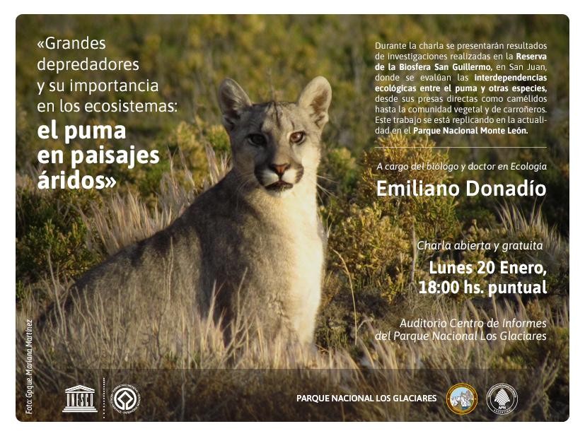 El lunes 20 de marzo a las 18 Hs en el Auditorio del Centro de Informes del Parque Nacional Los Glaciares se realizará una charla abierta y gratuita a cargo del biólogo y Doctor en Ecología Emiliano Donadío, sobre grandes depredadores y su importancia en la naturaleza.
