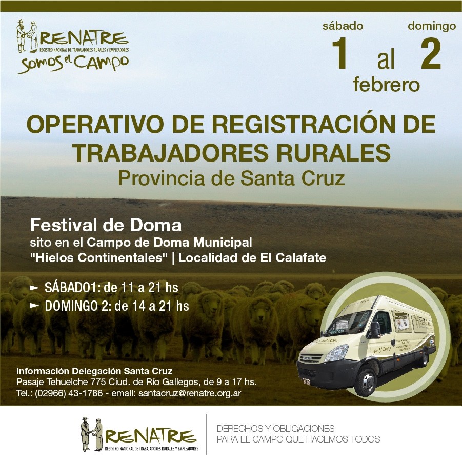 La Delegación del RENATRE (Registro Nacional de Trabajadores Rurales y Empleadores) en la Provincia de Santa Cruz realizará un Operativo de Registración Móvil donde espera llegar a cerca de 100 trabajadores rurales de la actividad ganadera en la localidad de El Calafate, los días sábado 1 y domingo 2 de febrero.
