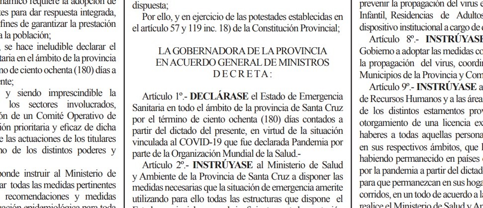 La medida fue decidida por la Gobernadora Alicia Kirchner y publicada en Boletín Oficial. Regirá por 180 días. Incluye varias medidas que abarcan también a municipios y comisiones de fomento. Se crea un Comité de Emergencia. Convocan a sesión extraordinaria en Diputados para ratificar la Emergencia. MIRA EL TEXTO COMPLETO