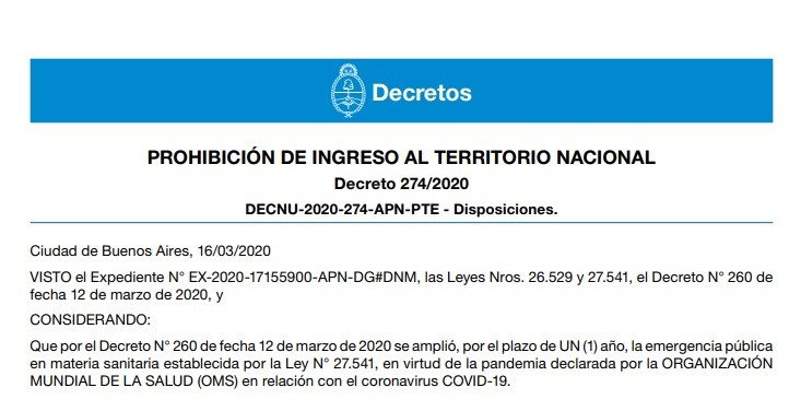 ARTÍCULO 1°.- Establécese la prohibición de ingreso al territorio nacional, por un plazo de QUINCE (15) días corridos, de personas extranjeras no residentes en el país, a través de PUERTOS, AEROPUERTOS, PASOS INTERNACIONALES, CENTROS DE FRONTERA y cualquier otro punto de acceso.