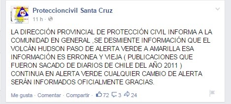 “La Dirección Provincial de Protección Civil informa a la comunidad en general: se desmiente información que el volcán Hudson pasó de alerta Verde a Amarilla. Esa información es errónea y vieja (publicaciones que fueron sacadas de diarios de Chile del año 2011). Continúa en Alerta Verde. Cualquier cambio de alerta será informado oficialmente” afirma a través de su cuenta de Facebook.