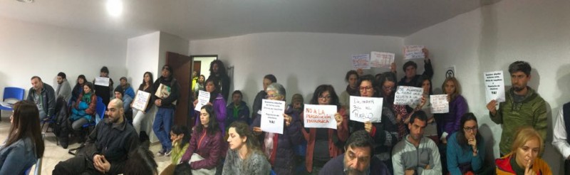 Ante la obligatoriedad de mantener el silencio en la sala, los vecinos optaron por expresarse escribiendo constantemente en papeles que exhibían, con fuertes críticas hacia los ediles del FPV-PJ.
