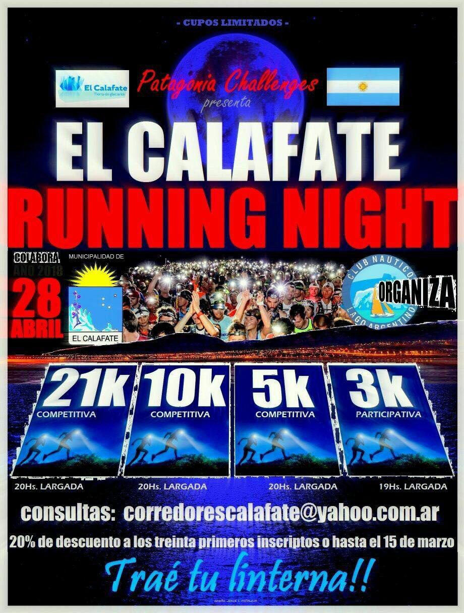 El 2° Running Nocturno El Calafate, es una carrera a realizarse el día 28 de este mes en la Villa Turistica de Santa Cruz, República Argentina. Esta competencia de atletismo está organizada por “Club Náutico Lago Argentino” y con la colaboración de la Municipalidad de El Calafate.
