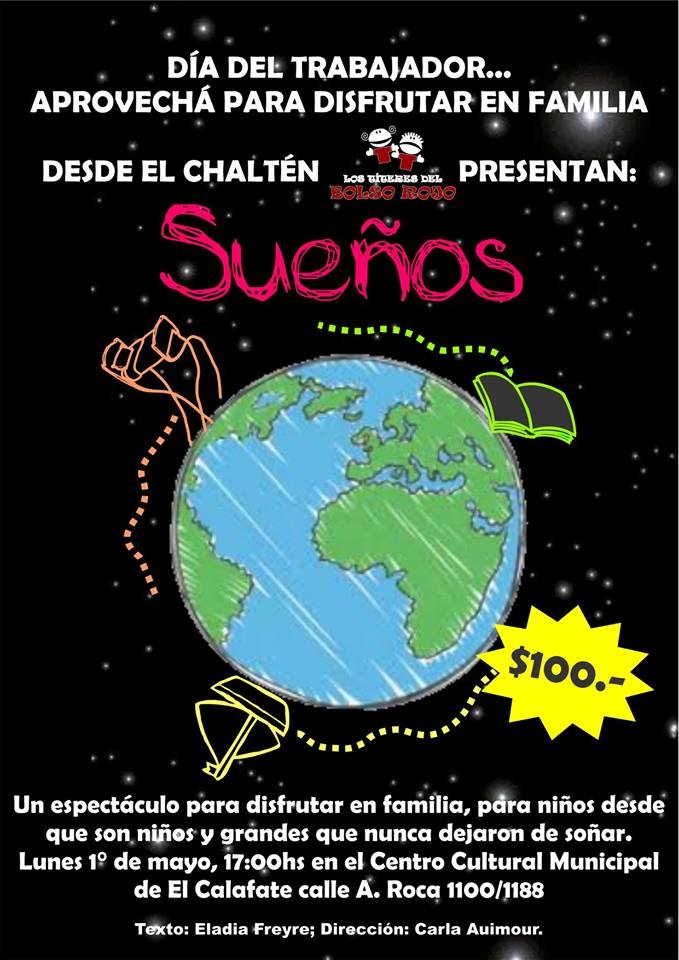 Este martes 1° de mayo a las 17 hs en el Centro Cultural Municipal de El Calafate se presentará la obra infantil de títeres “Sueños”, una creación del grupo de Teatro “El Bolso Rojo”.
