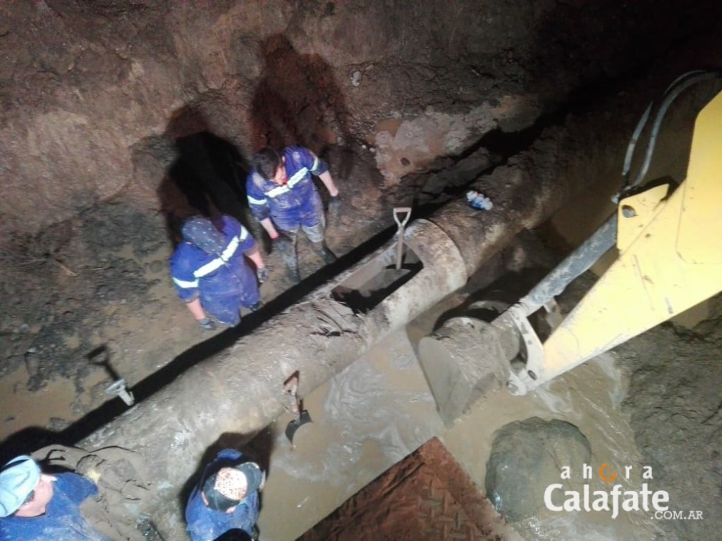 Es un tramo de la captación de agua del Lago Argentino hacia la planta Potabilizadora, que está paralizada. Operarios especializados viajan desde San Julián. Varios vecinos que no tienen tanque de reserva comienzan a sentir la falta de agua. Piden restringir al máximo el consumo.