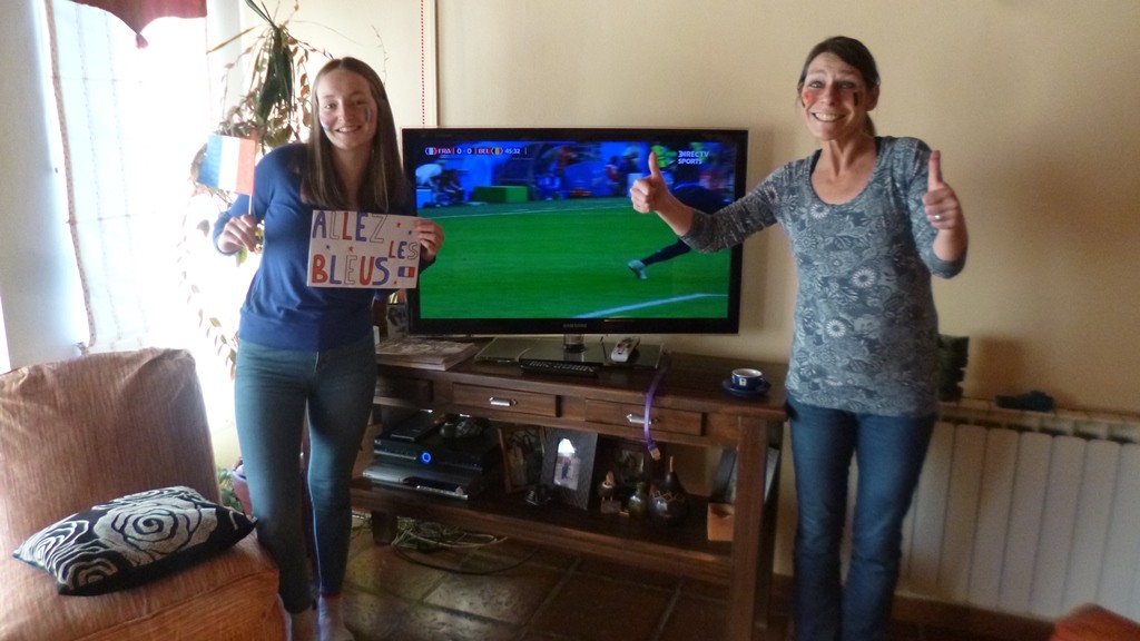 Mientras Coralie con una bandera de papel que ella misma, junto a unos carteles, fabricó, los flamea mirando la televisión. Las dos cada tanto miran sus celulares, porque familias y amigos de Bélgica, Francia y Argentina les escriben.