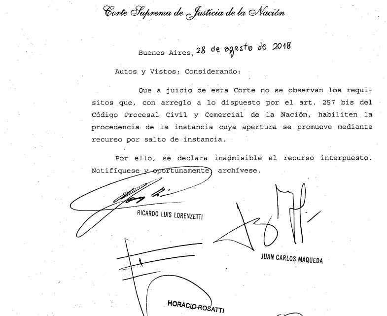 La ONG había solicitado este Recurso extraordinario por salto de instancia, con el patrocinio letrado de los Dres. Daniel Sabsay y Cristian Fernández. Éste último, en dialogo con FM Dimensión, explicó que en su decisión la Corte Suprema “no se mete a analizar ninguna de las cuestiones de fondo”, que se plantearon.